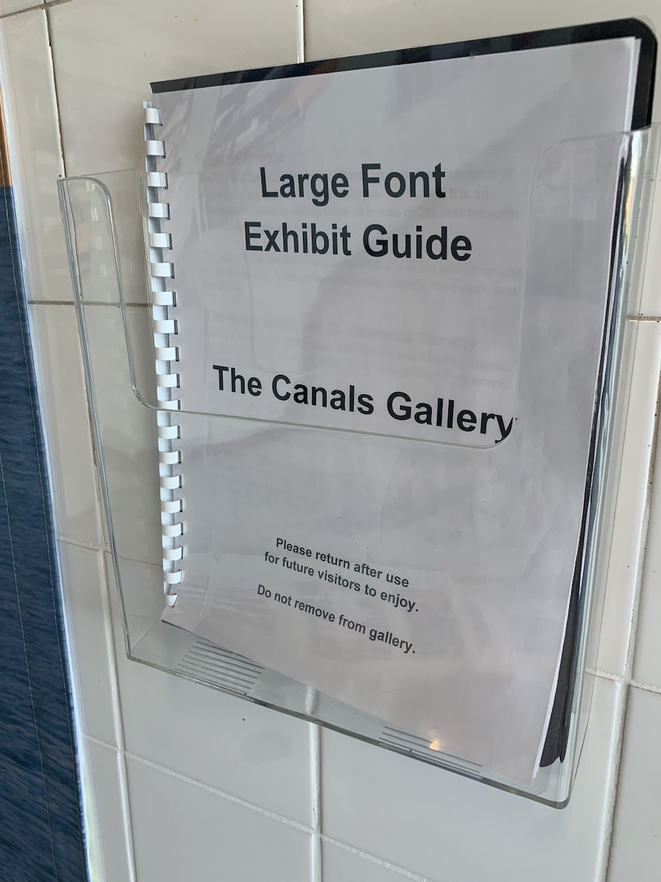 A "Large Font Exhibit Guide" of the the Canals Gallery is available for visitors that may have difficulty reading some of the smaller texts in the exhibits and displays.