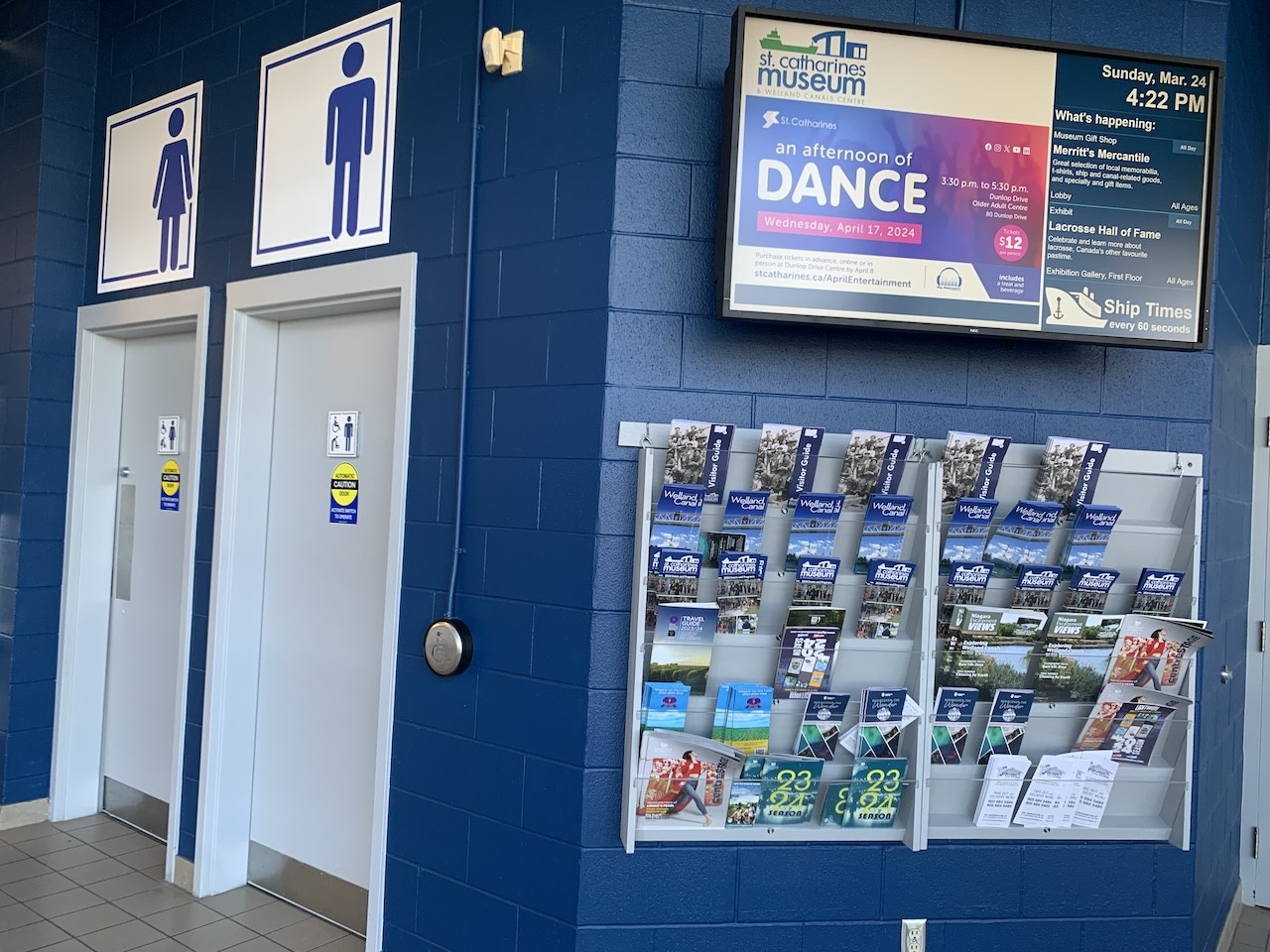A television screen providing information and events throughout the community can be found beside a set of public restrooms in the main lobby of the St. Catharines Museum and Welland Canals Centre.