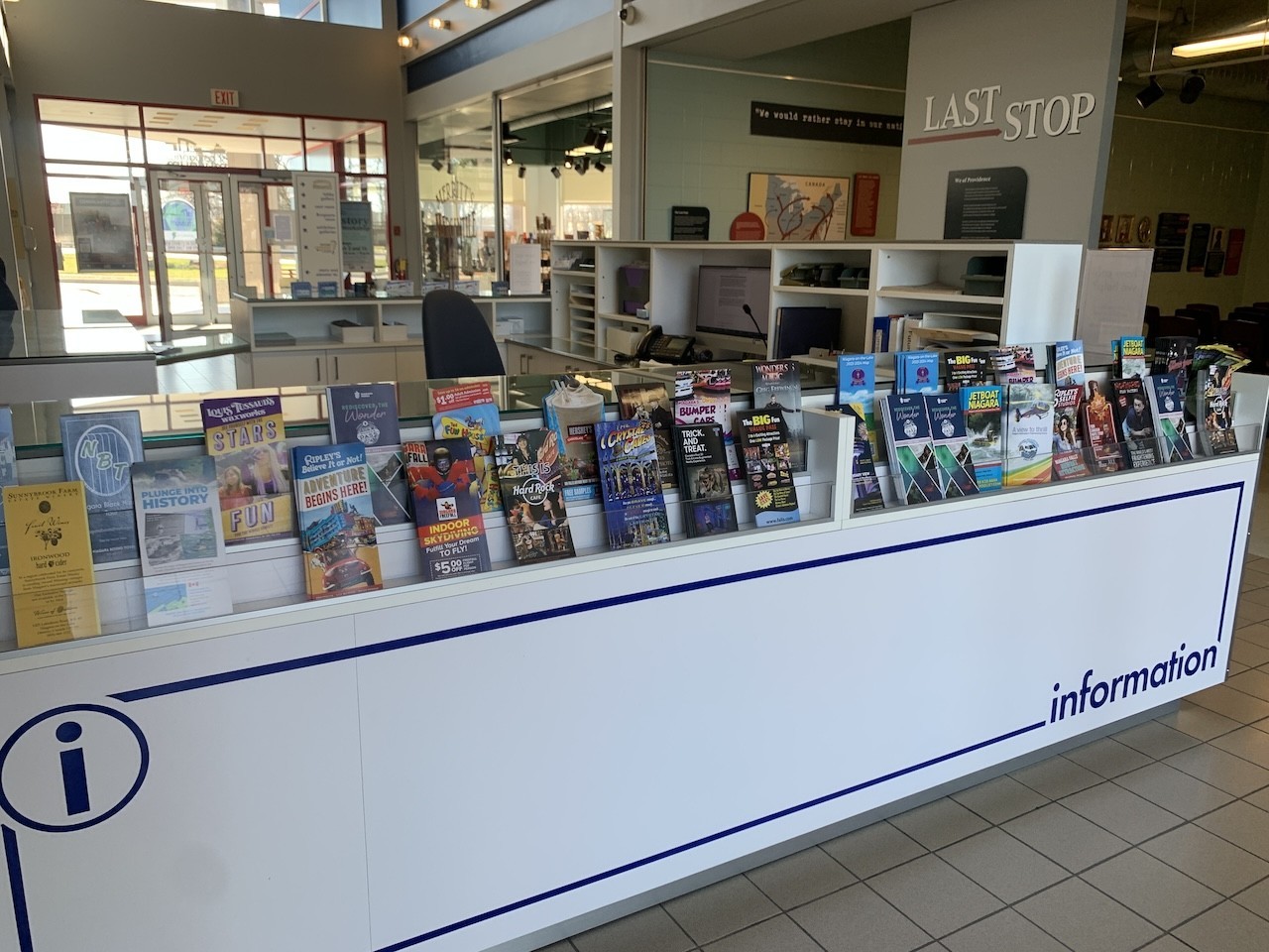 The information desk in the lobby of the St. Catharines Museum and Welland Canals Centre offers a variety of pamphlets and materials promoting attractions and information from the Niagara area.