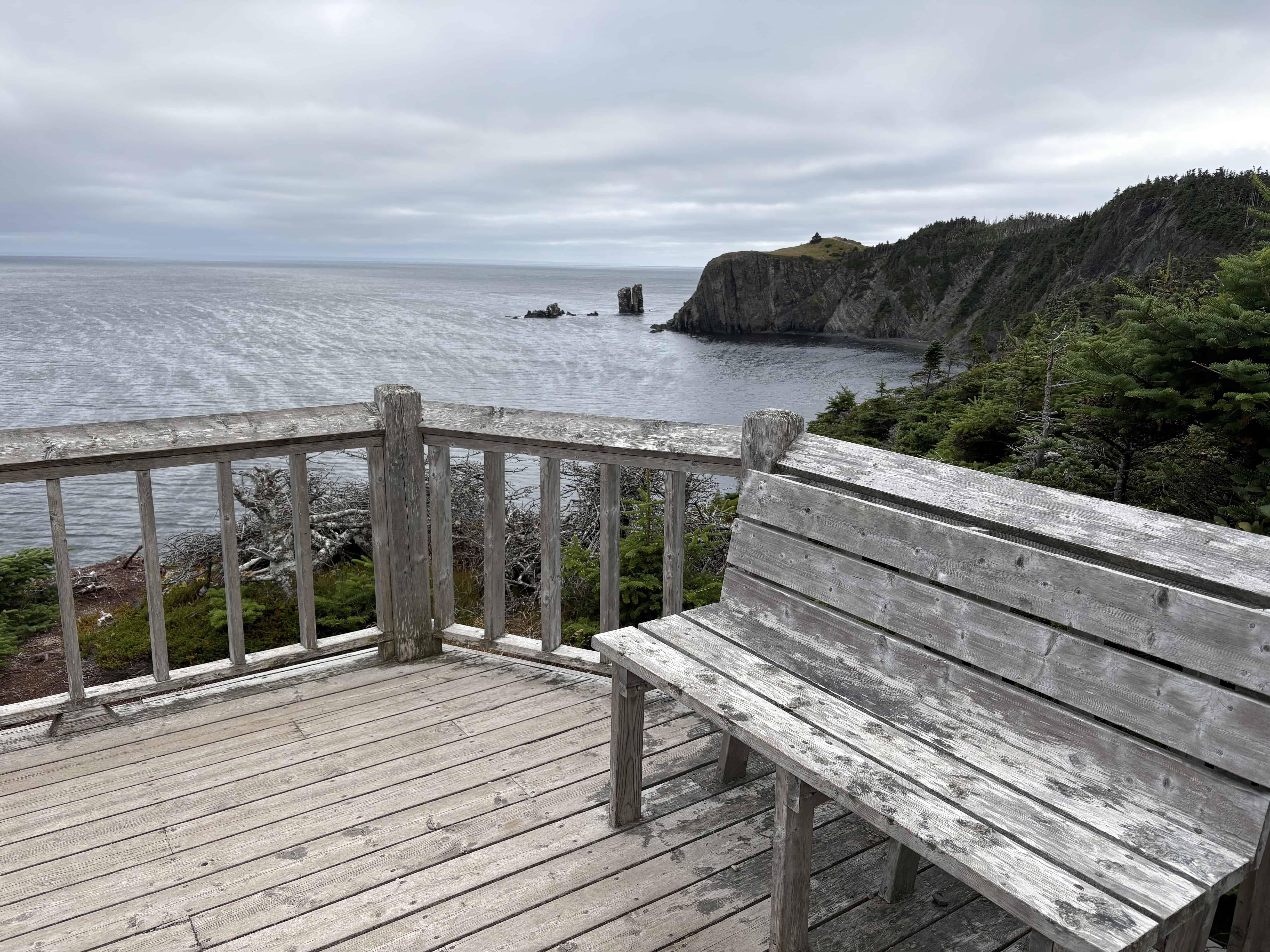 This viewing platform with a bench for resting is one of the best locations to take in the scenic views of the shoreline while hiking the Skerwink Trail in Newfoundland, Canada.