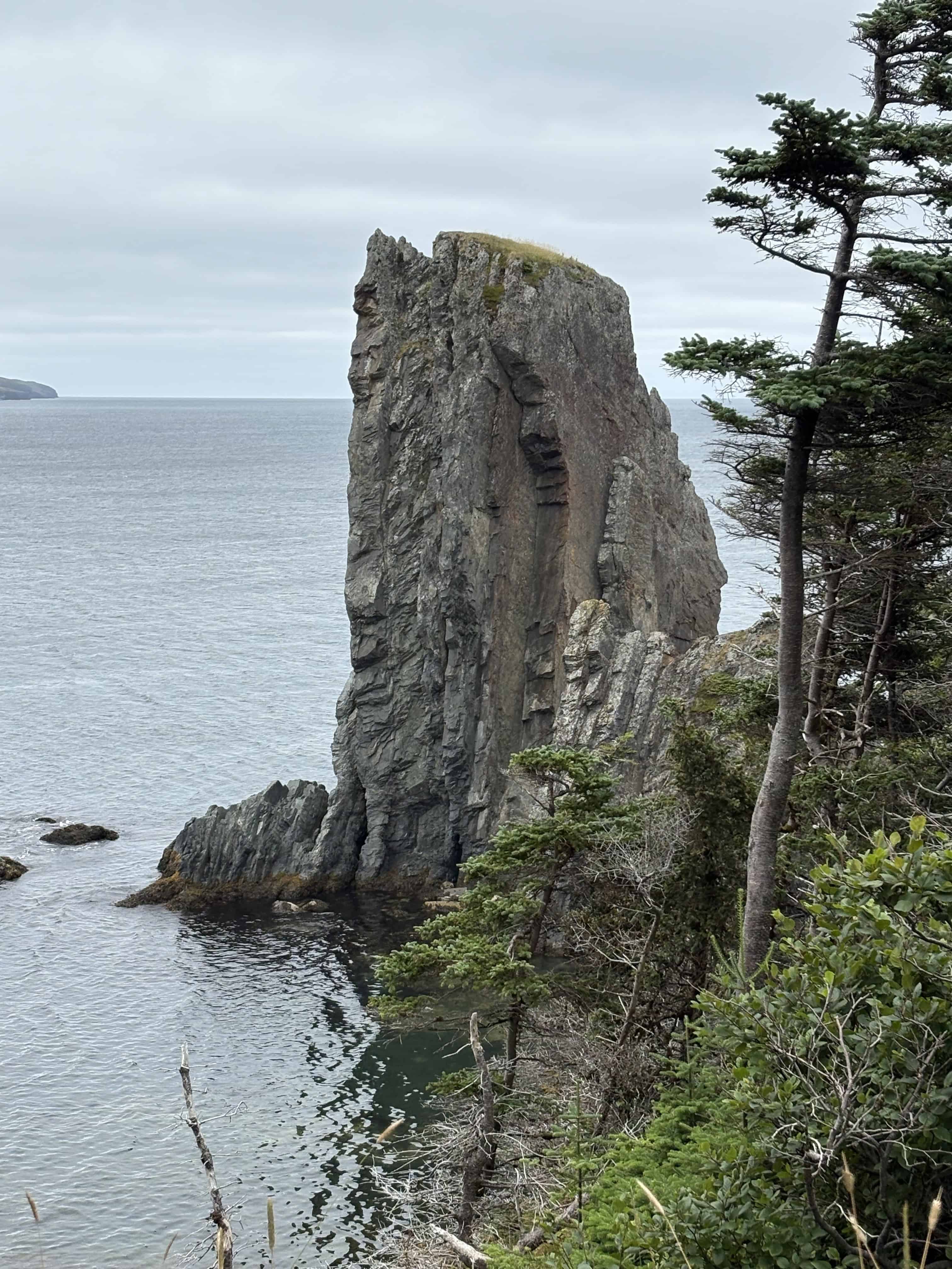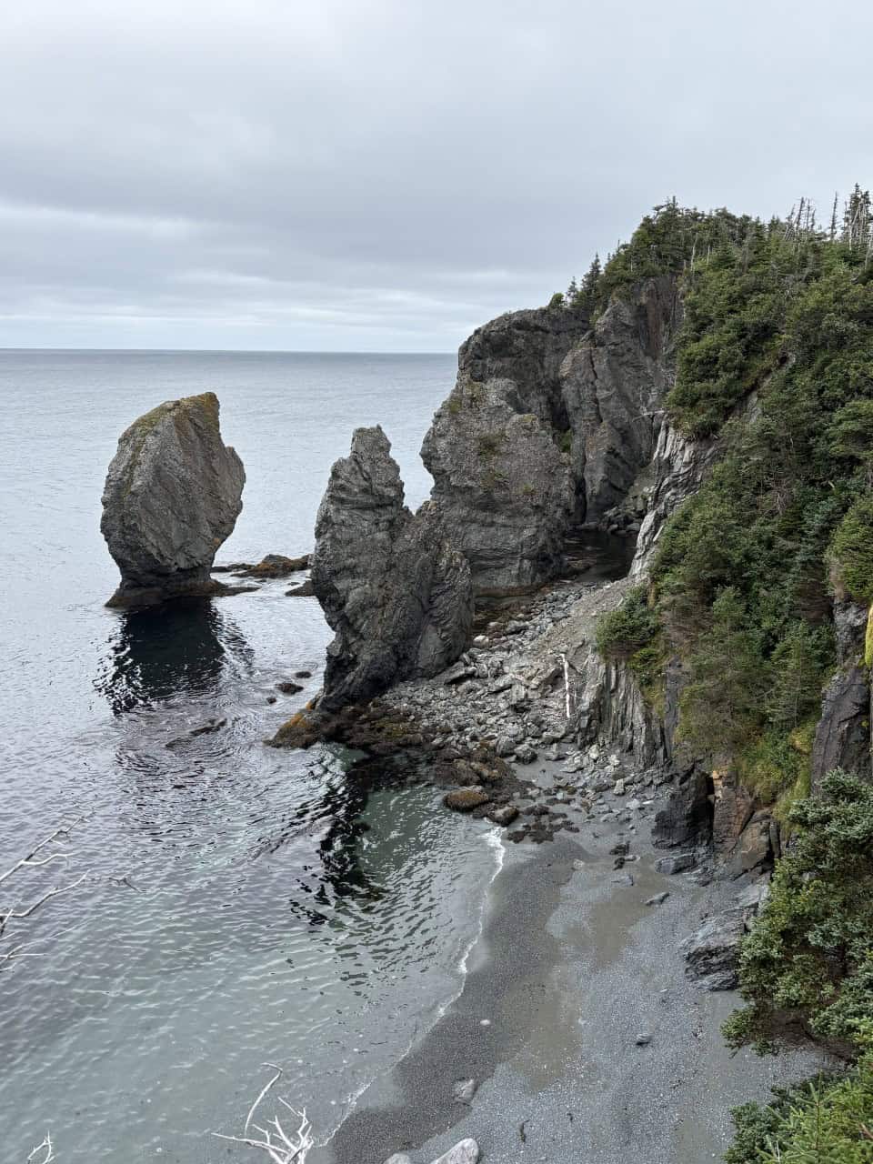 The towering rock pillars on the shoreline of the Skerwink trail can be viewed from various spots along the hike in Newfoundland, Canada.