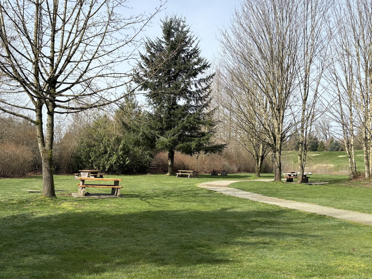 Aldergrove Regional Park has picnic areas and trails with well maintained lawns and trails. It is the perfect spot to stop and go for a walk and have a leg stretch in British Columbia, Canada.