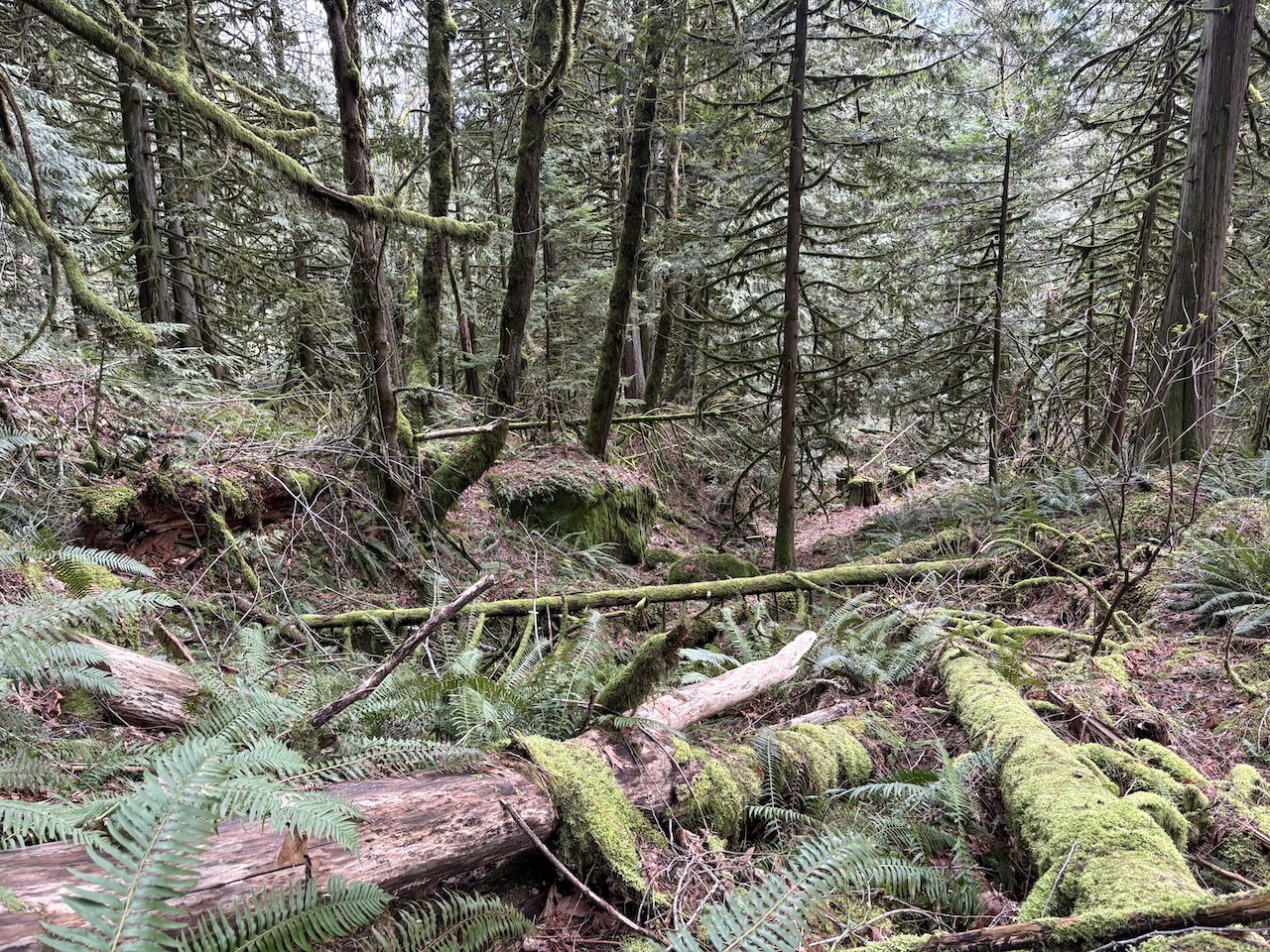 The lush green forest with massive trees on the Serpent's Back Trail was different from the snowy mountains from earlier in the road trip.