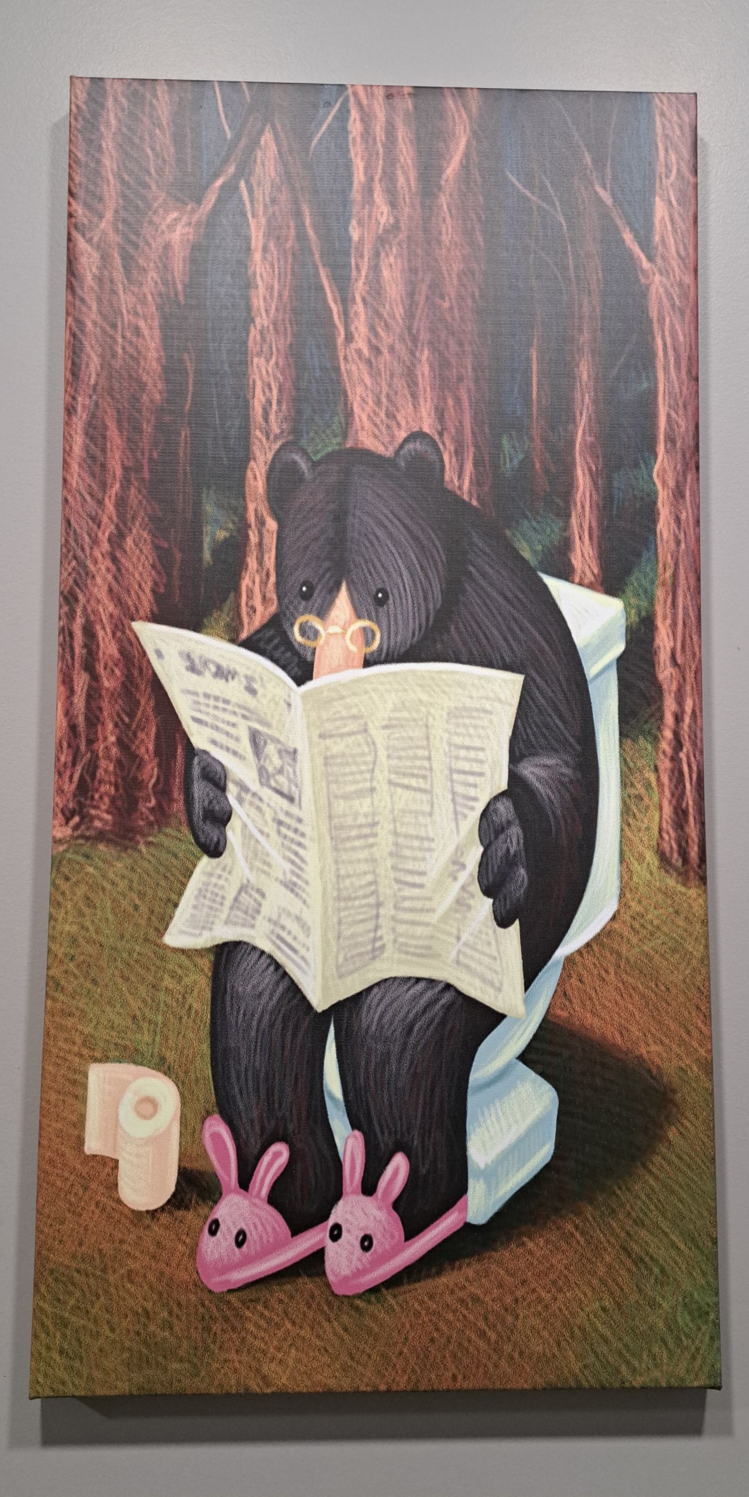 Even the bathrooms have personality. A female bear casually sitting on the toilet, reading a newspaper in the woods? Unexpected. Slightly hilarious. Completely on brand.