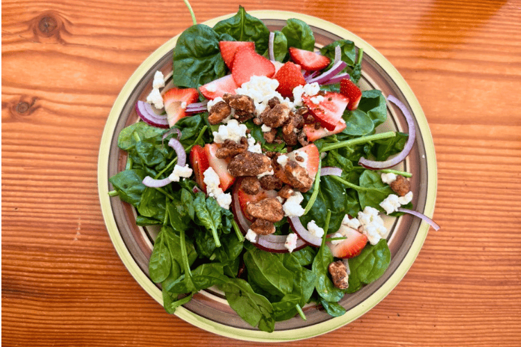 Local strawberries, baby spinach, red onion, chèvre, candied walnuts, and mandarin vinaigrette makes for a fabulous, light, delicious salad. This was my choice.