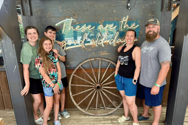 These are the good old days - we take a family photo at the sign every chance we get. This was a special family photo as my oldest daughter was visiting from university and able to join us for dinner and rafting! These really are the good old days!