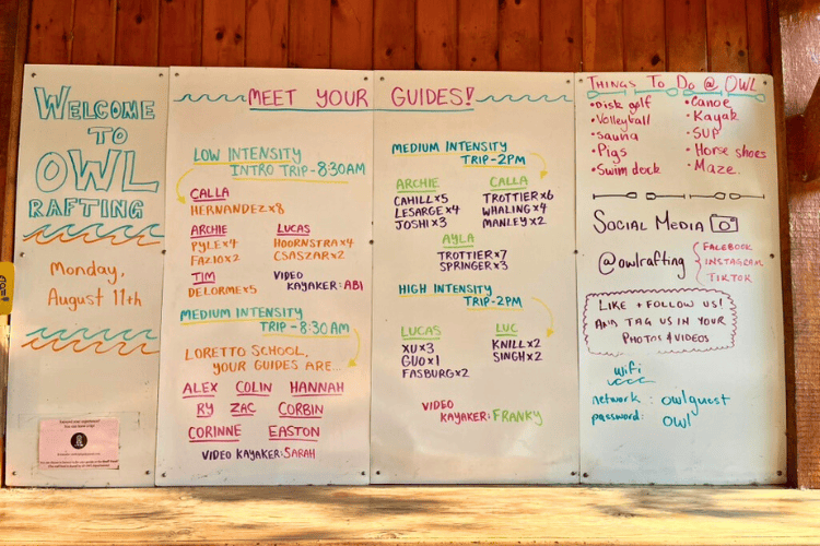 OWL posts the plan for the day on a massive whiteboard located just outside of the store. Our rafting day was Monday, August 11 - there were MANY groups going out that day!