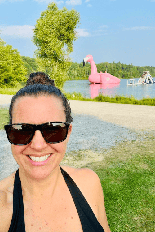 I'm not going to lie - I laughed out loud when I saw this 15 foot giant pink flamingo out in the bay with the waterpark obstacles at Splash Valley Waterpark and Resort. I knew there was a good time ahead!