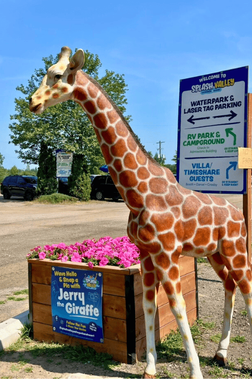 Helping visitors find were they need to go, Jerry the Giraffe stands tall near the direction sign. "This way to the fun!" he seems to say.