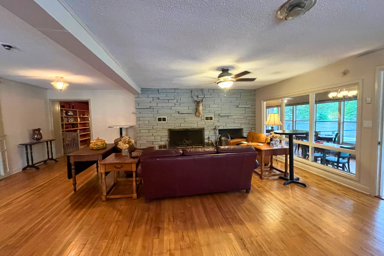 Cozy lounge at Hotel Kenney boasts a wood burning fireplace, comfortable sofas, and panoramic water views of the Rideau Canal and historic Lock 42.