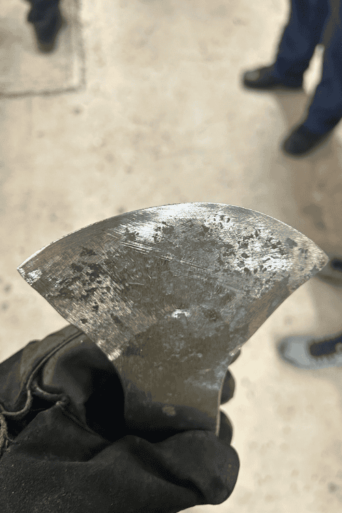 After some grinding, Jason's hand-forged axe head is shiny and very sharp!