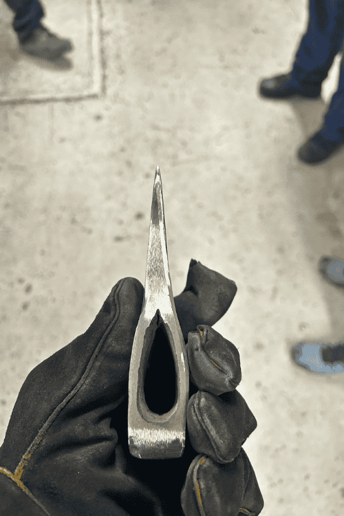 Jason and Jay work together, one holding the tool over the hot steel, while the other swings the hammer. Together, over many strikes of the hammer on the hot steel, the axe head begins to take shape.