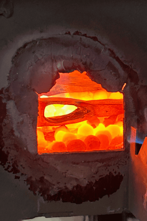 A glimpse inside the Mighty Forge while the door was opened to retrieve a block of molten hot steel, ready to be shaped using traditional blacksmithing techniques at Axcadmy, Toronto, Ontario.