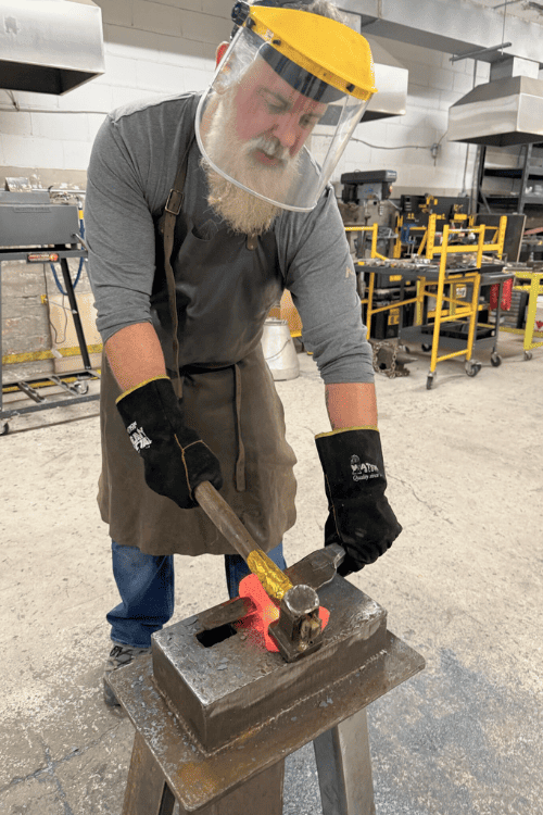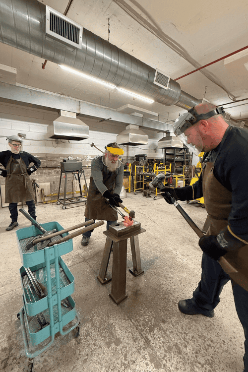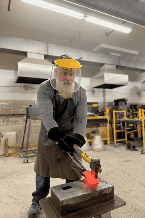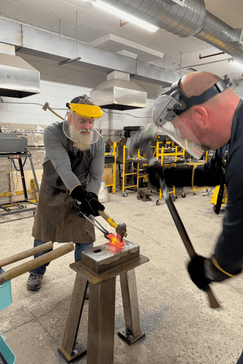 Heating and hammering, like traditional blacksmiths, at Axcadmy in Toronto, Ontario.