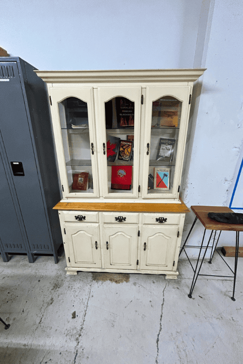 A dining hutch makes a great storage display of books and paraphernalia describing the art of blacksmithing and information on axes.