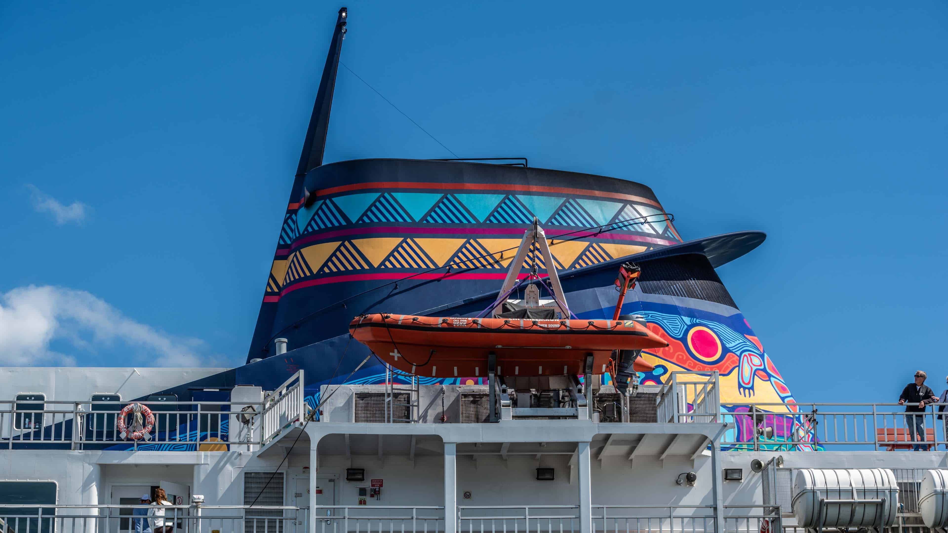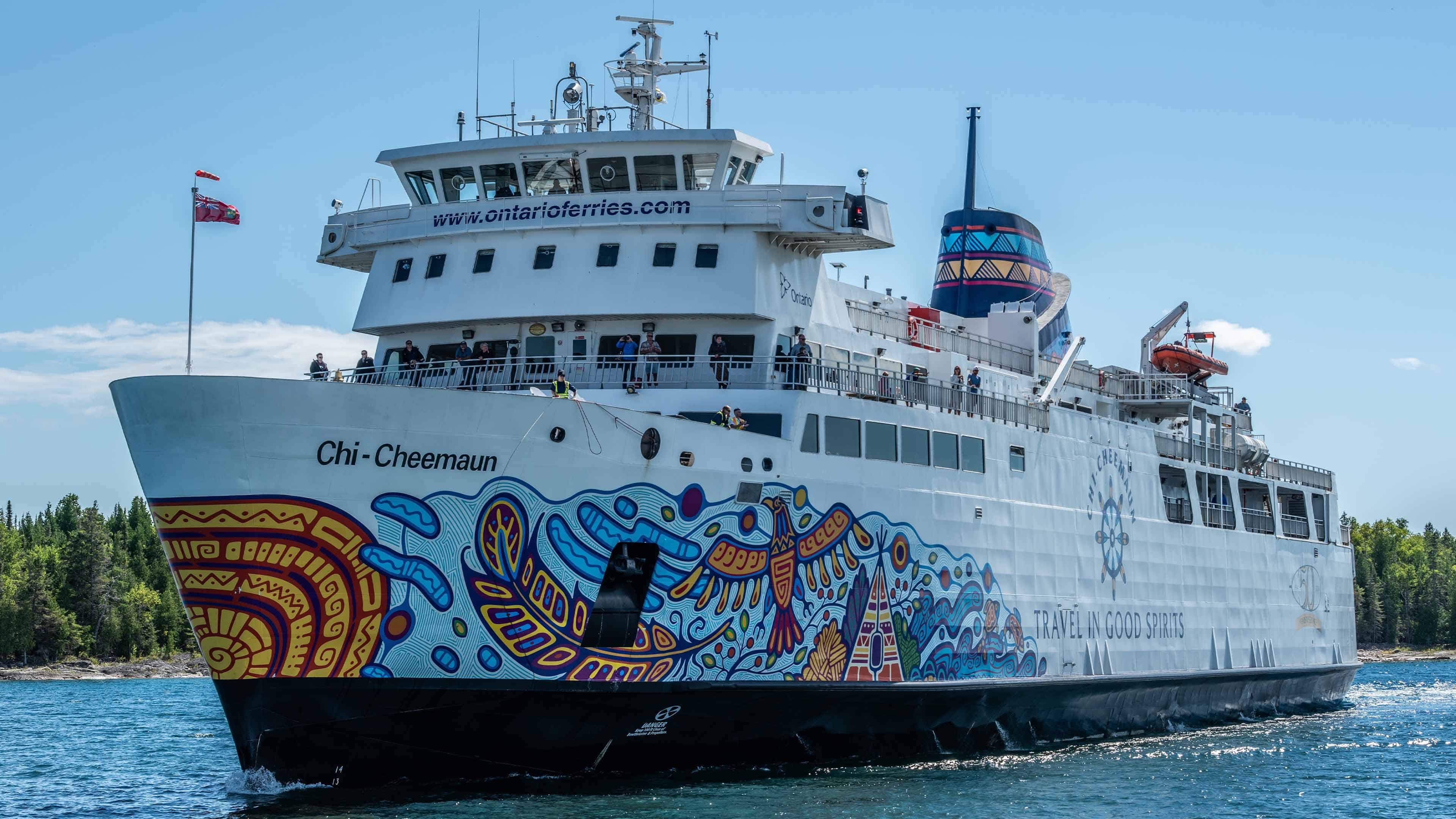 The Chi-Cheemaun Ferry is painted as part of a cultural and branding project that celebrates Indigenous art and heritage while making the ship itself an iconic symbol of Manitoulin Island and Ontario tourism.