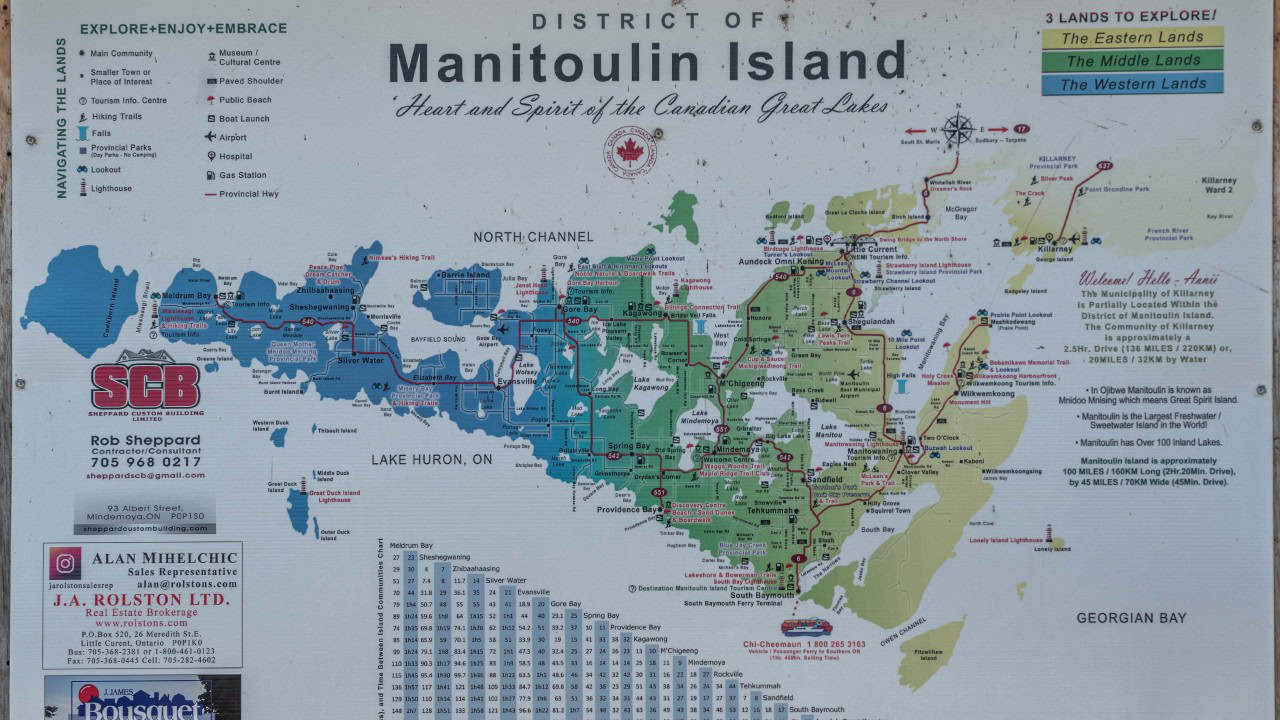 Map of Manitoulin Island, along with trails and attractions
