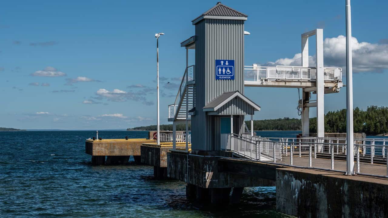 The Chi Cheemaun ferry is arriving at the pier in South Baymouth, Manitoulin Island