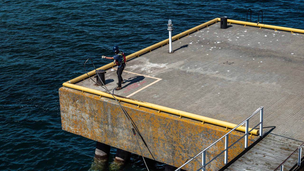 As the engines of the Chi Cheemaun ferry began to roar, a crew member on the pier tossed the cable holding the ferry to the pier.