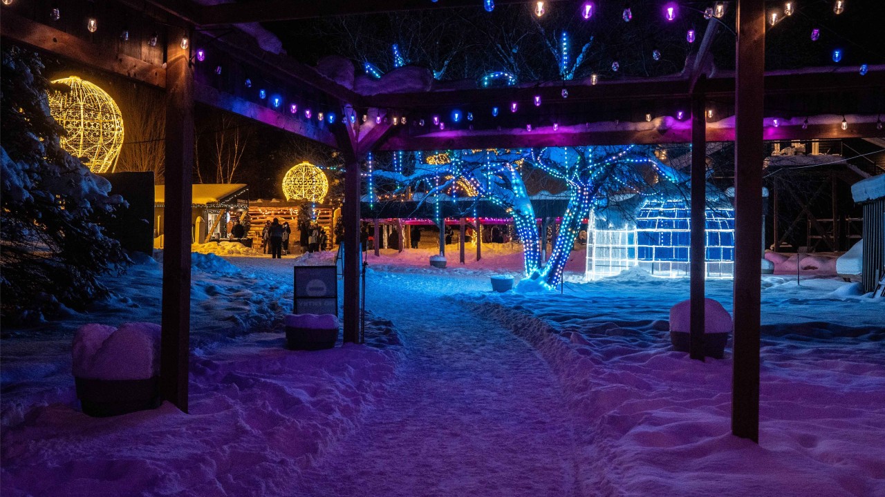 The beauty of winter at night, all lit up at the forest of lights at the Sandhill Nursery in Huntsville, Ontario, Canada