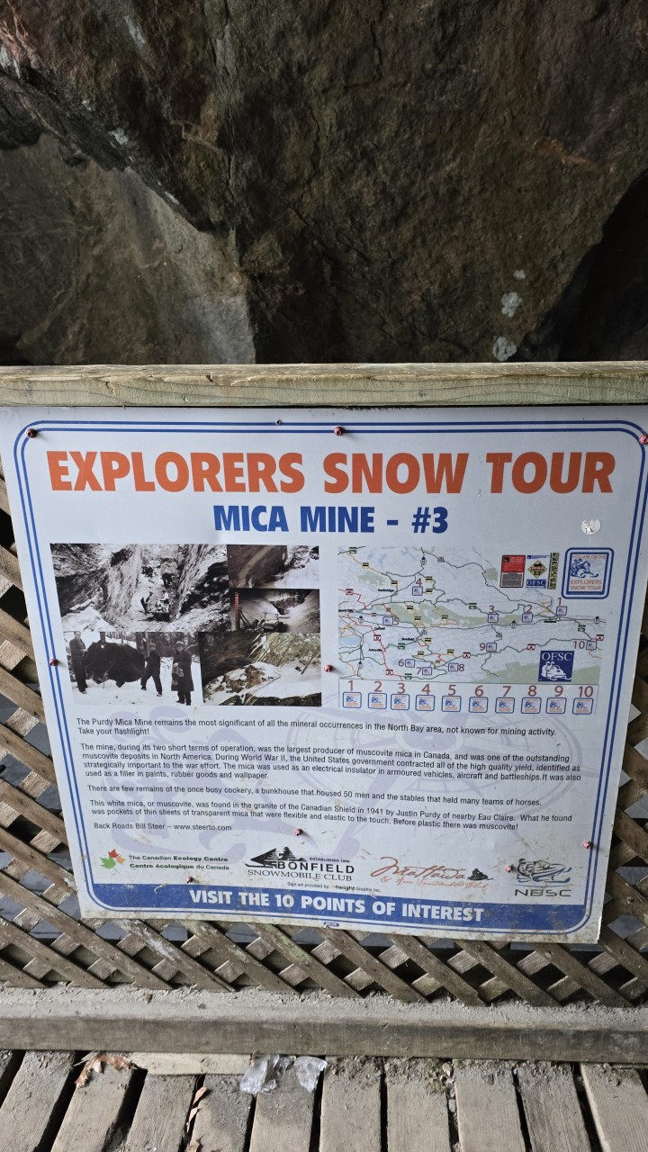 Today, the Mica Mine is most commonly accessed by snowmobile via OFSC trails in winter, with access also possible by ATV or on foot through the Voyageur Multi-Use Trail System in warmer months. Just outside Mattawa and within easy reach of North Bay, this hidden Northern Ontario gem offers a quick but memorable stop where riders can step off the trail, explore the rock formations, and experience a unique piece of Ontario’s mining history firsthand. I read they offer guided tours at times. Likely in the summer months.