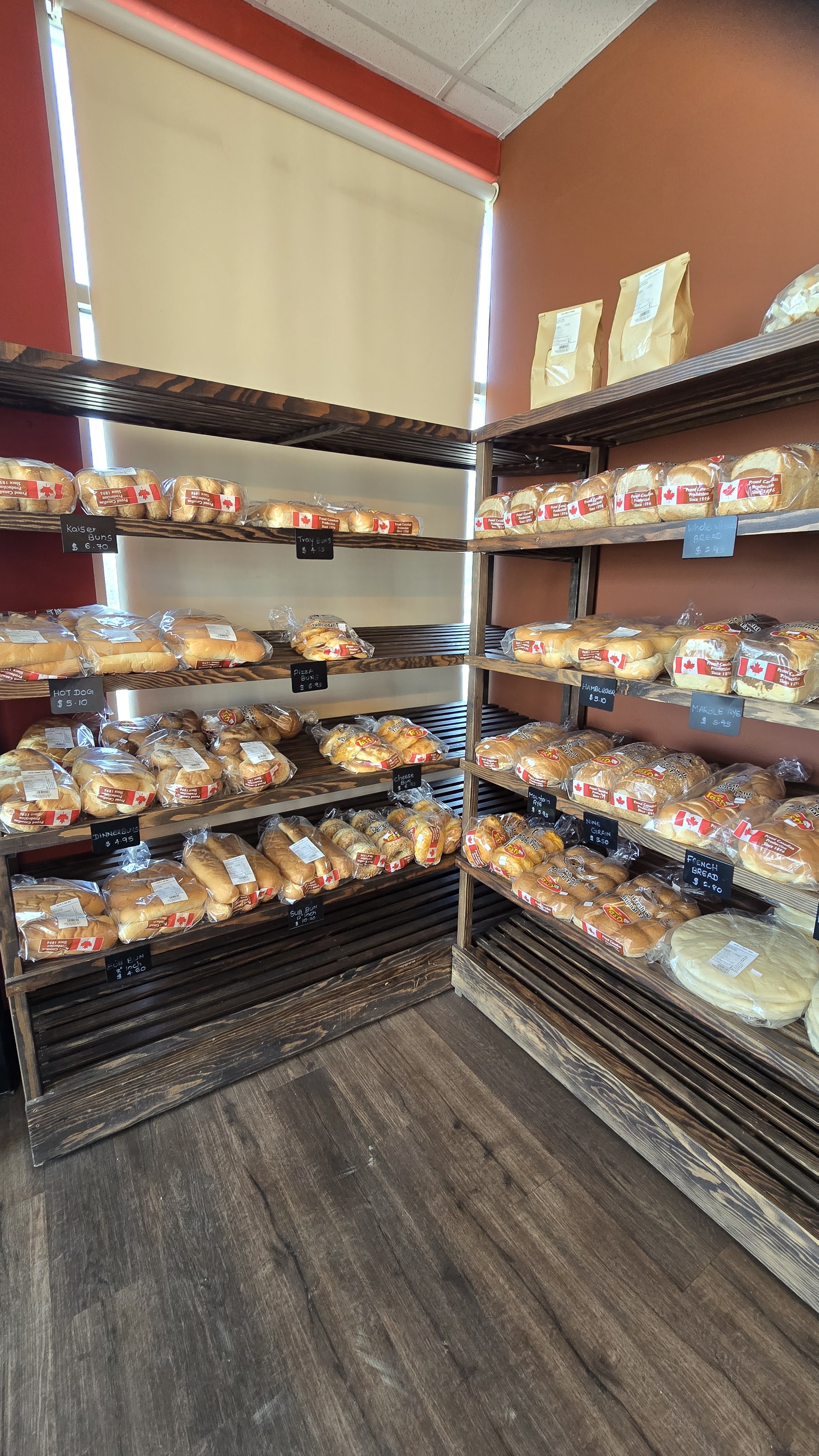 Shelves of fresh baked bread including buns and loaves at Mountain House Bakery in Red Deer, Alberta