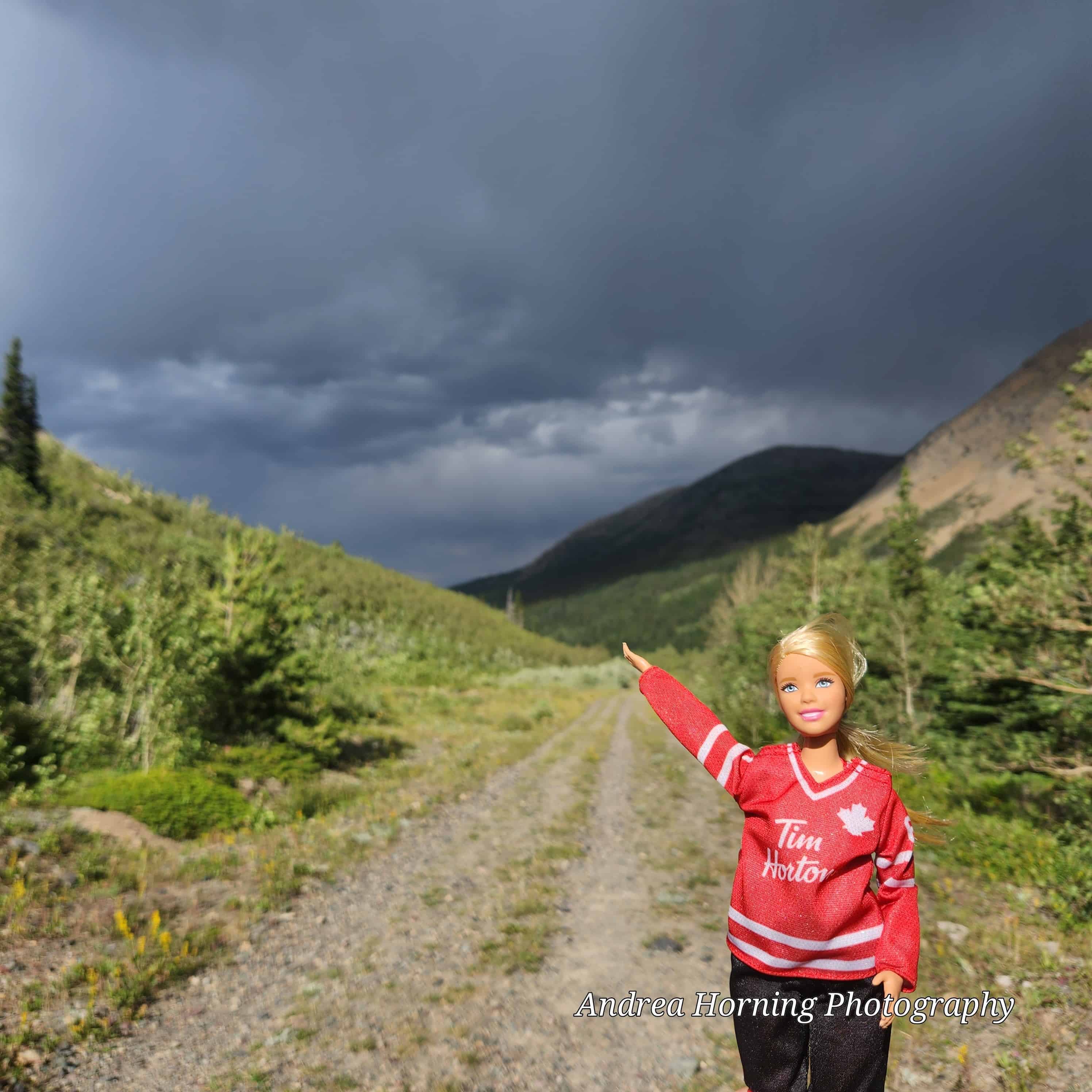 Barbie doesn't shy away from bad weather! Here she is in Castle Provincial Park hiking during a storm!