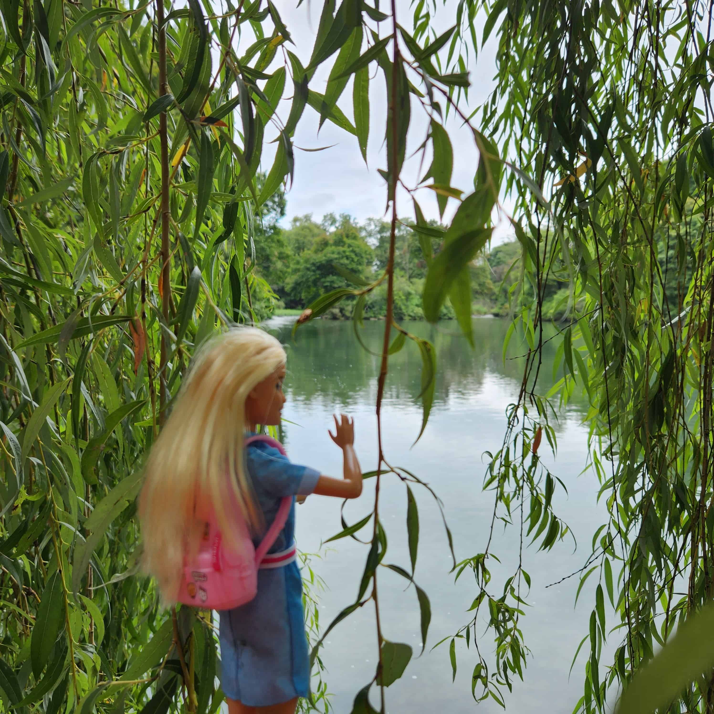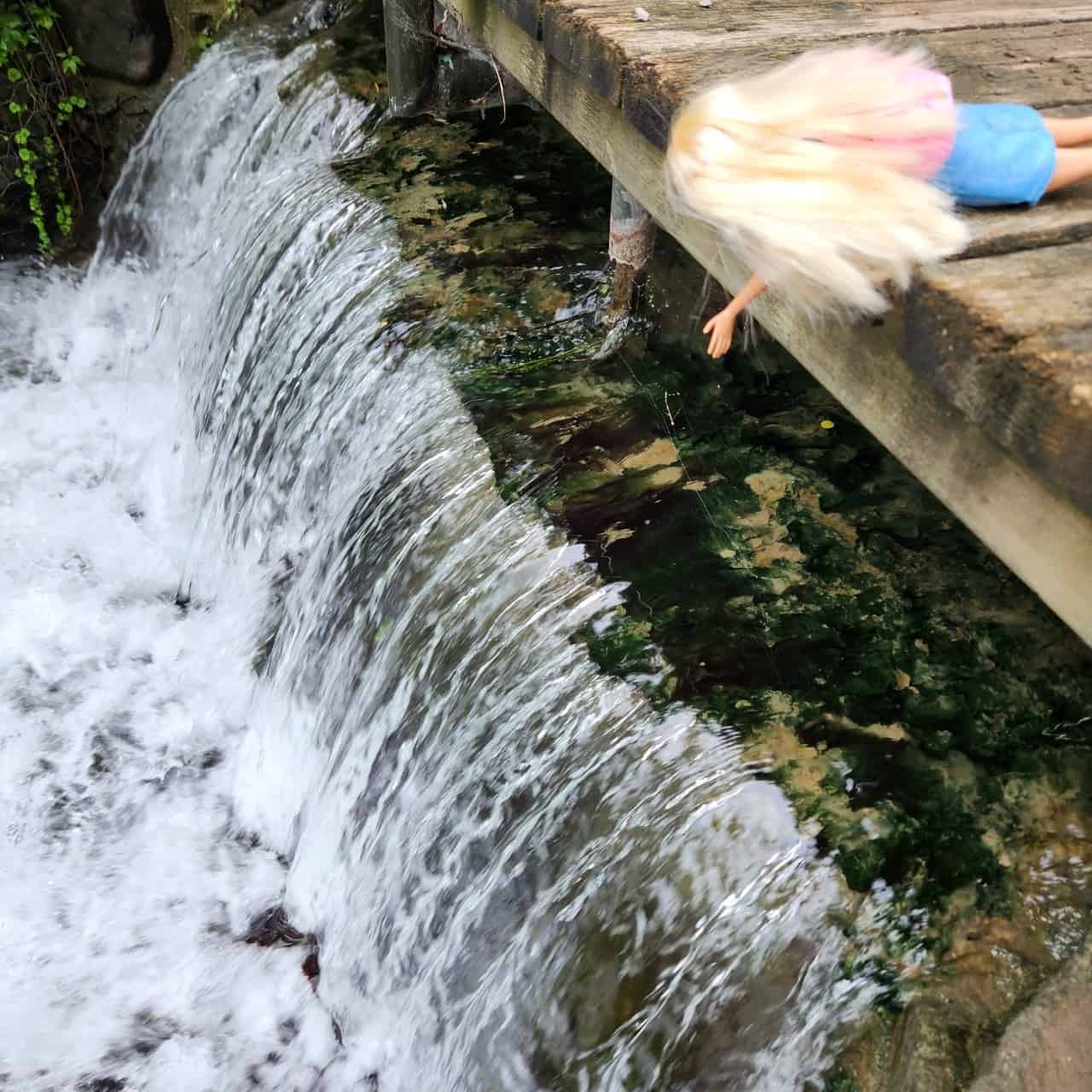 Barbie playing around in Niagara Falls, trying to reach for the mini falls while found on a hike