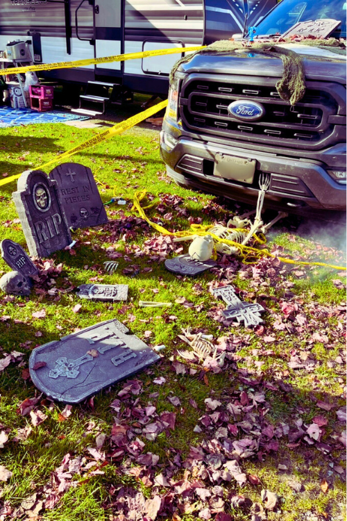 Who camps beside a graveyard? Apparently we do! Looks like that truck drove right over that unsuspecting graveyard skeleton!