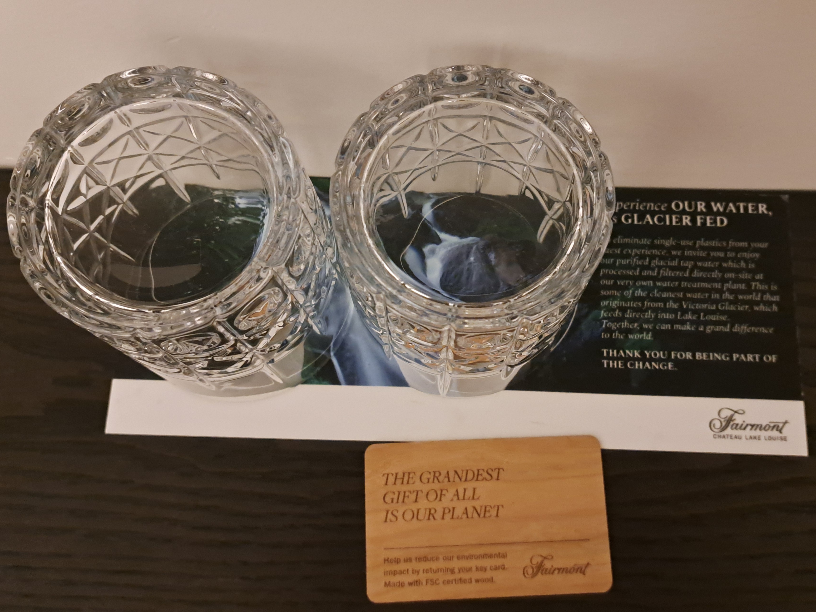 Wooden room keys and beautifully crafted glasses are filled with purified glacial water. Sourced on-site, it offers guests a refreshing and sustainable Stay in Banff Lake Louise experience.