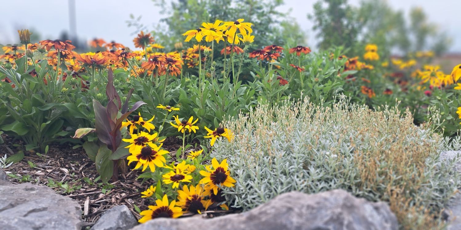 Bright Rudbeckia bloom in the flower beds near the Visitor Centre. Wander among yellows, oranges, and reds. Perfect for photos or enjoying a cheerful splash of summer colour