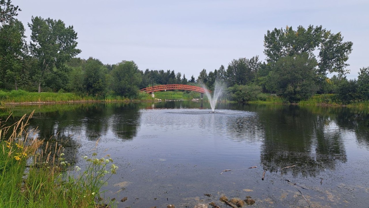Spotted from the highway, the red bridge invites you to stop. Walk across, enjoy the pond and fountain, and soak in this welcoming, peaceful park.