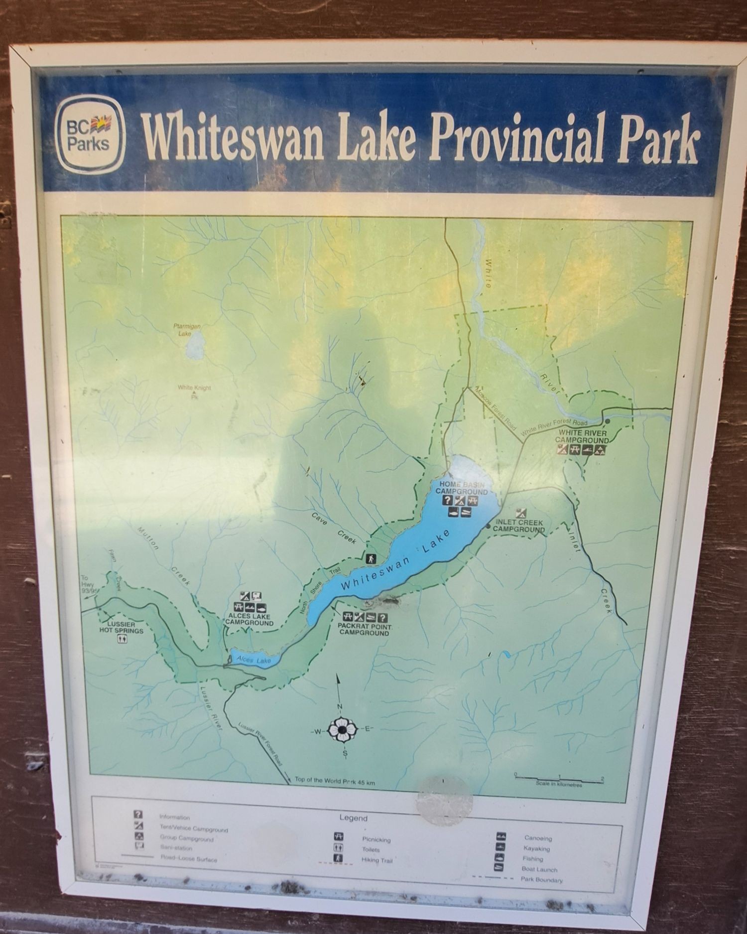 A helpful map shows Whiteswan Lake, Alces Lake, trails, campgrounds, and the hot springs. It gives visitors a quick overview before heading down.