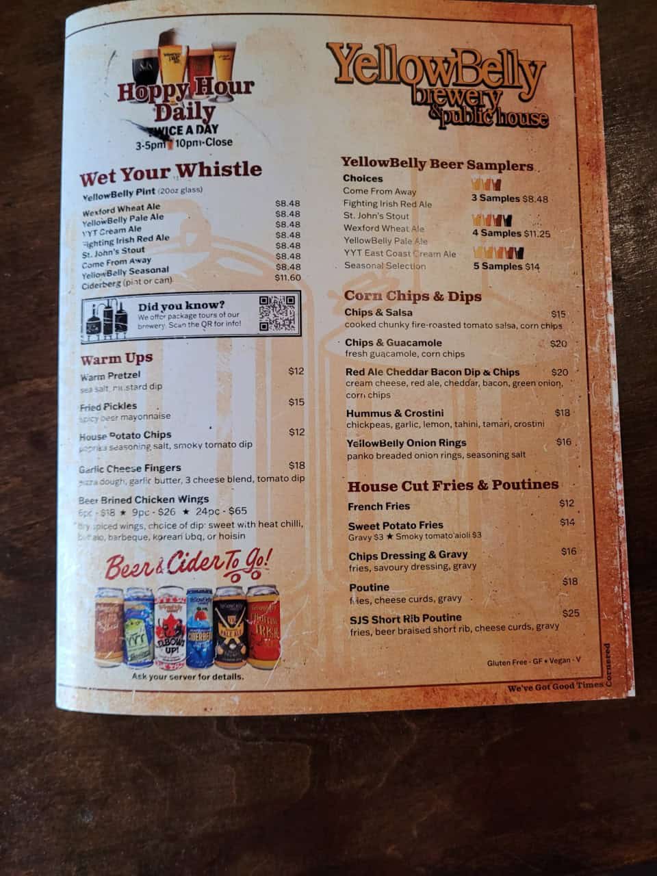The diverse and mouth-watering menu at St. John's Yellowbelly Brewery, featuring local favourites like fish and chips, house-made sausages, and flavourful hummus. Perfect pairings with their signature craft beers for a satisfying meal.