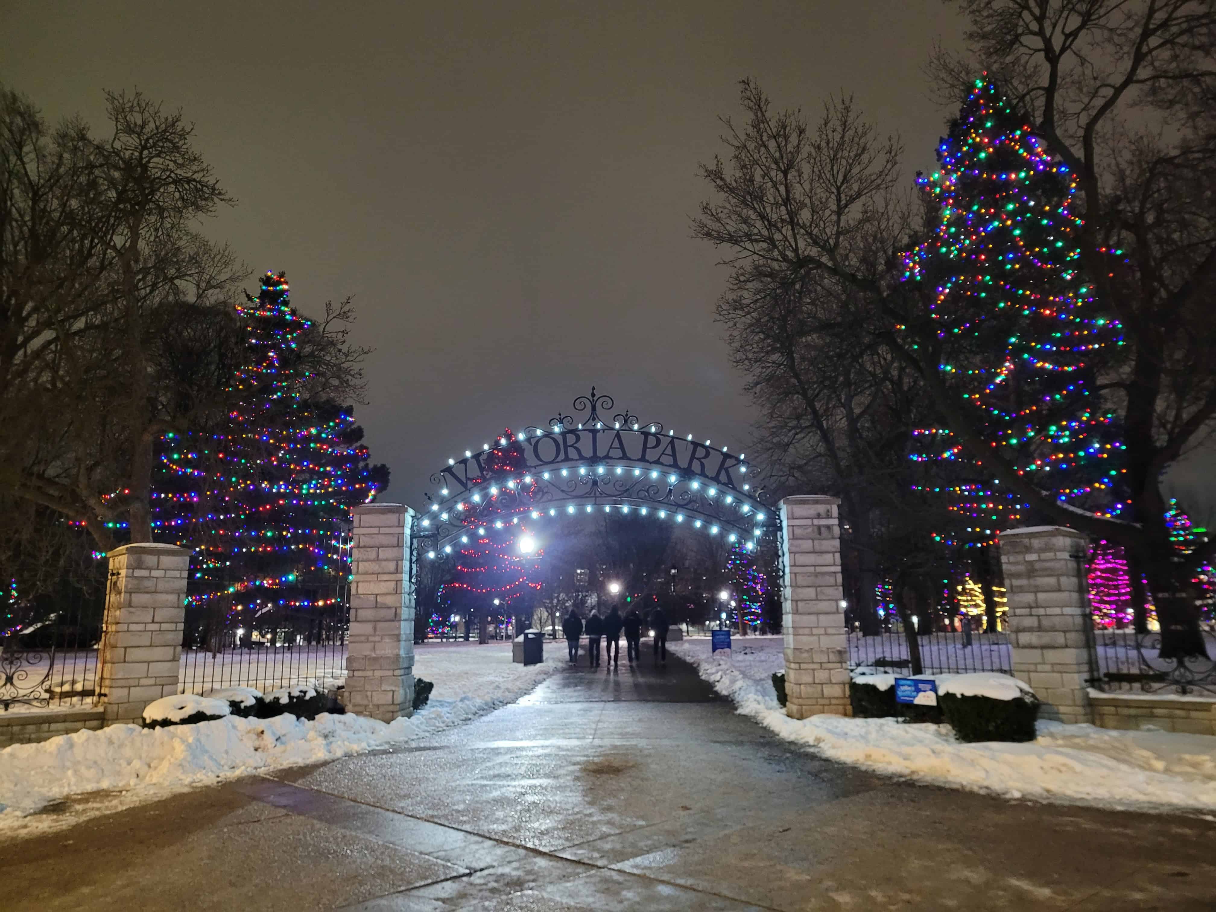 The entrance gate to Victoria Park is beautifully illuminated during the Lighting of the Lights in downtown London, Ontario. A festive welcome to the winter wonderland inside, filled with holiday magic.