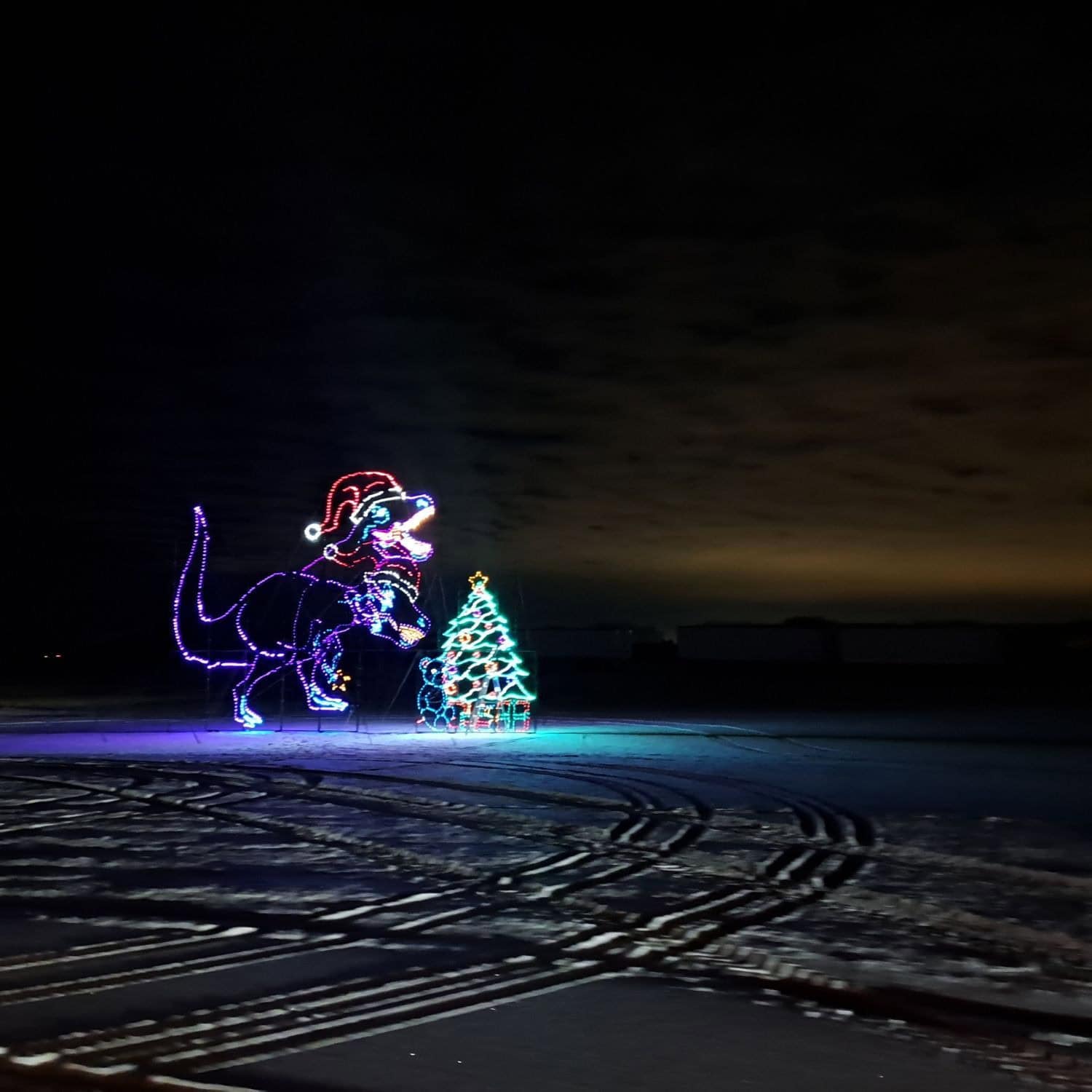 A glowing T Rex towers along the route, adding awe and whimsy to the drive and creating one of the festival’s most memorable displays.