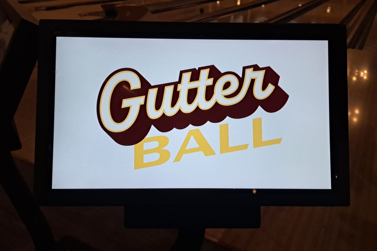 Bowling lane screen showing everyone that I got another a gutter ball at Encore Brewing Company, part of the retro bowling alley experience in Cranbrook BC.