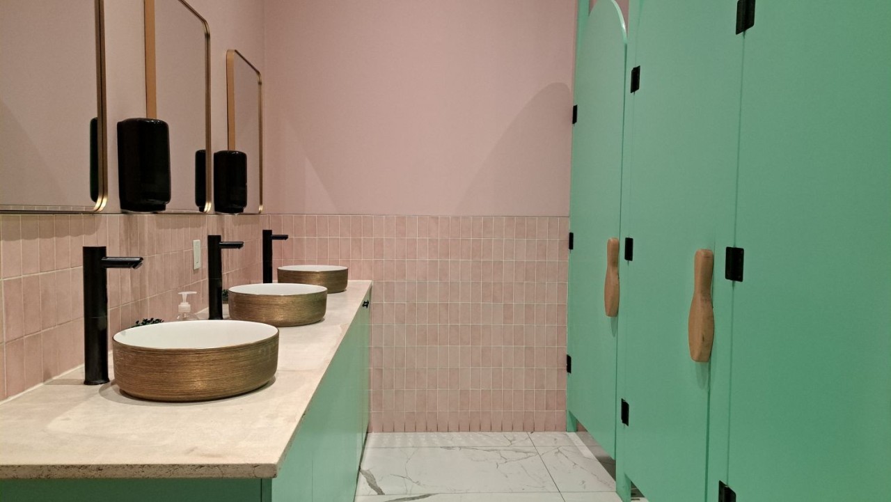 Retro pink and mint green bathroom at Encore Brewing Company, featuring bowling pin door handles and vintage-inspired design details that reflect the building’s bowling alley history.
