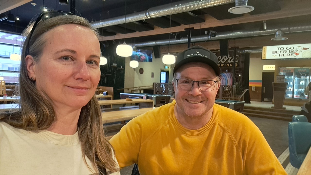 Adventure Seeker selfie at Encore Brewing Company in Cranbrook BC, a stop on a Kootenay road trip featuring craft beer, bowling, and retro arcade games.