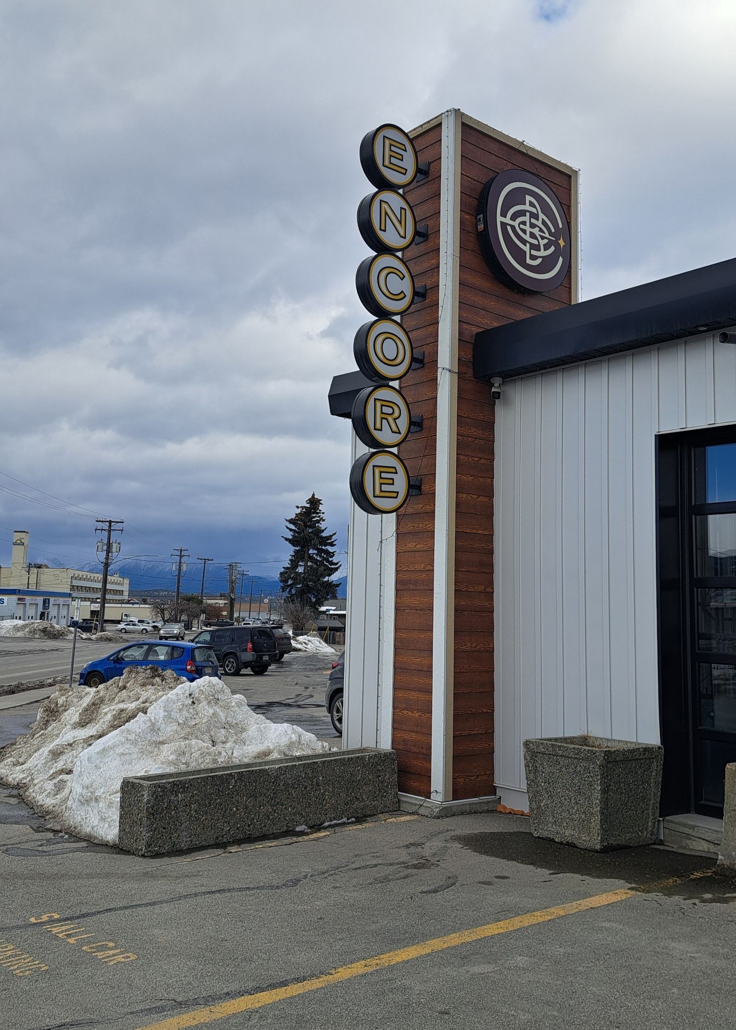 Encore Brewing Company exterior in Cranbrook BC, a restored 1960s bowling alley turned retro-themed brewery, restaurant, and bowling alley.