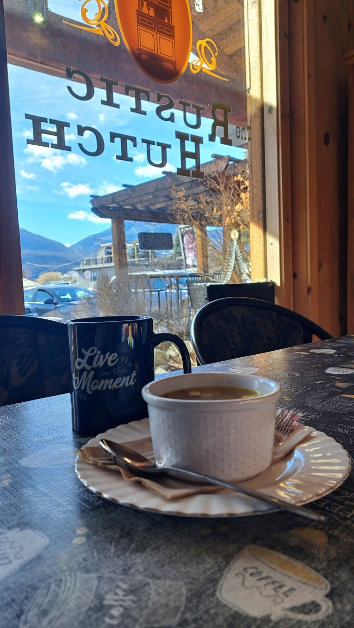A cup of coffee and a bowl of soup at Timber Hitch Coffee Shop in Kimberley, BC, enjoyed by the window. A great stop for a light lunch after visiting Marysville Falls or exploring the area.