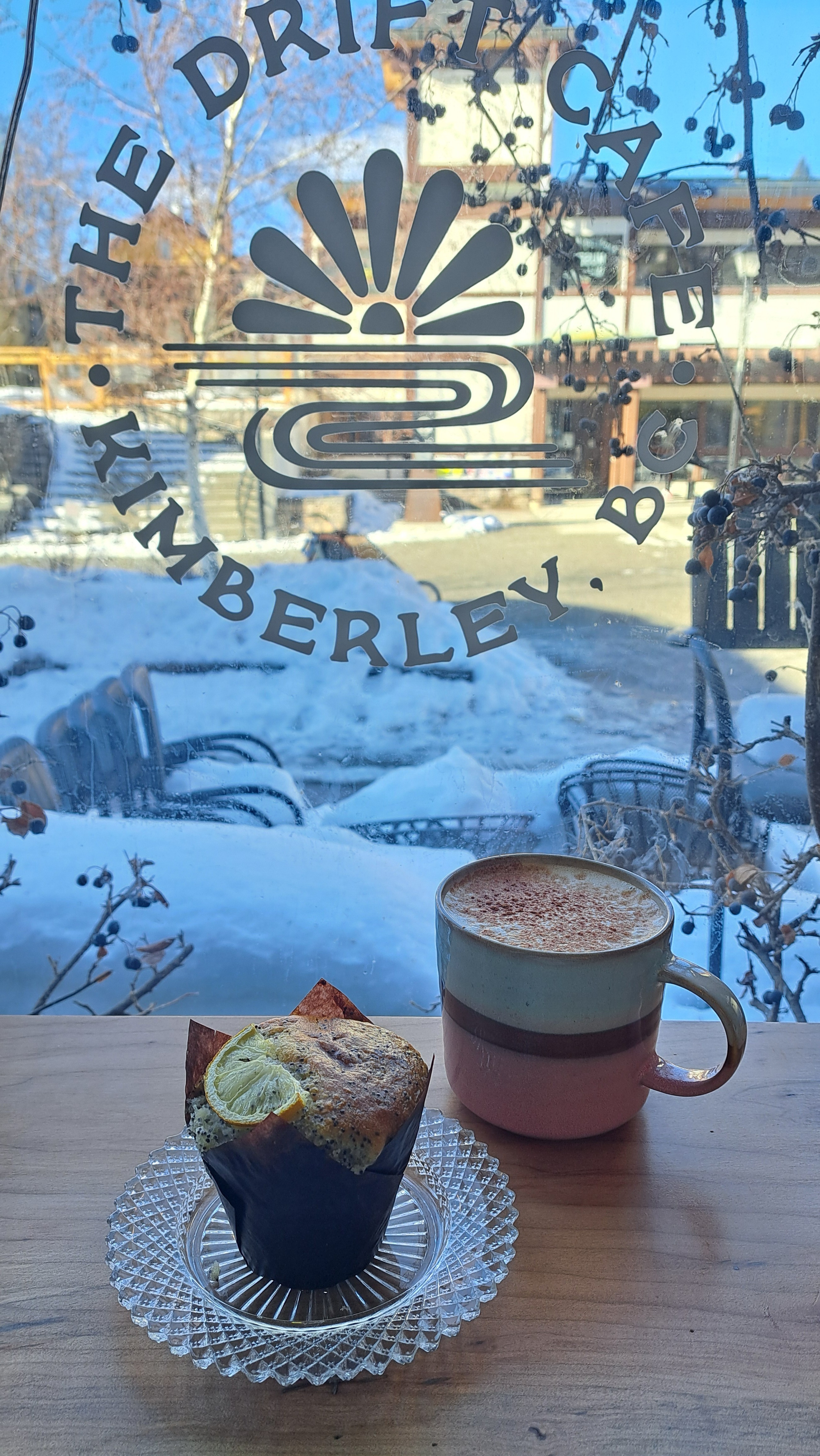 Coffee and a fresh muffin at The Drift Café in Kimberley, BC, enjoyed by the window overlooking the Platzl and downtown activity.