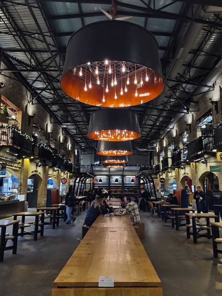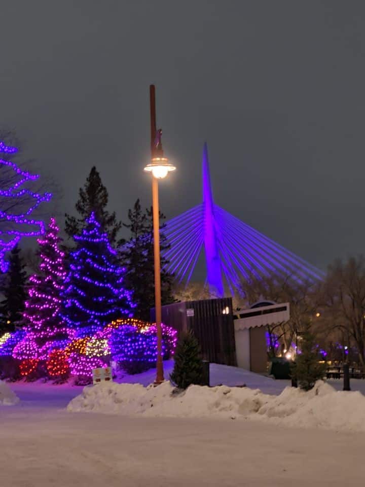 We rolled into Winnipeg close to 10 PM — several hours late but still welcome. Stepping into Union Station felt like entering a cathedral of warmth. While the train was resupplied and cleaned, we wandered outside to see The Forks glowing under a magical display of Christmas lights. Winter magic was in the air!